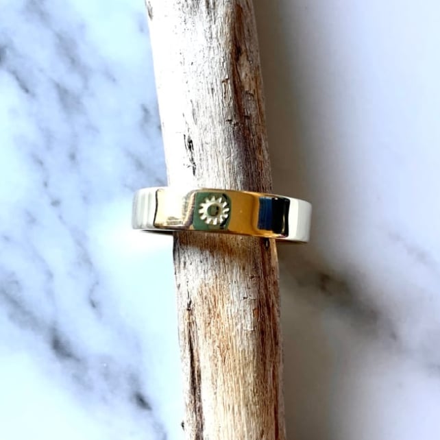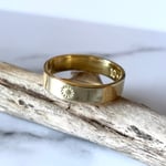 Ring is made from 100% recycled 1.3mm gold and is 5mm wide. This gives a high quality feel which is not too heavy. This ring will last a lifetime.