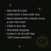 Handmade 9ct gold ring stamped with a crescent moon and two tiny retro stars.