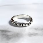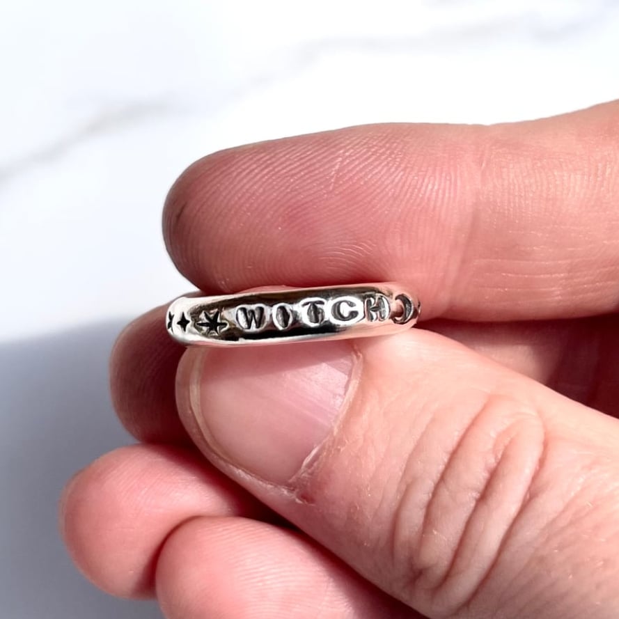 Handmade chunky rounded Sterling silver ring stamped with the word WITCH and a selection of stars and moons all the way round the band.
