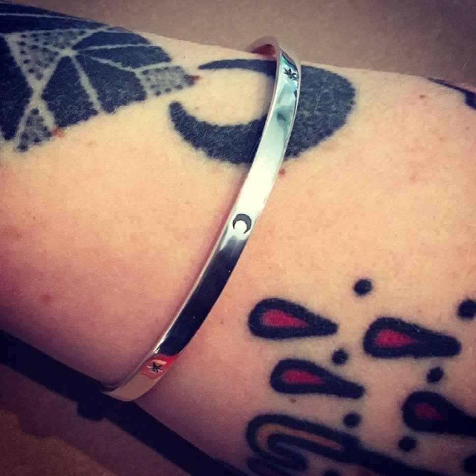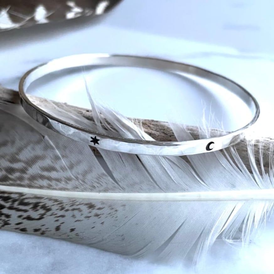 Handmade Sterling silver bangle stamped with crescent moon and star shapes.
