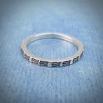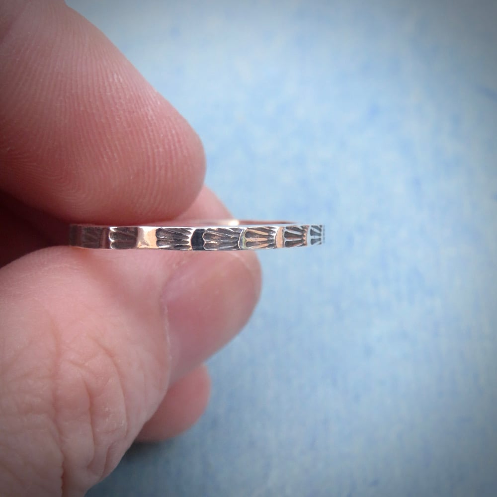A slim sterling silver band, hand-stamped with repeating marks like echoes through time.