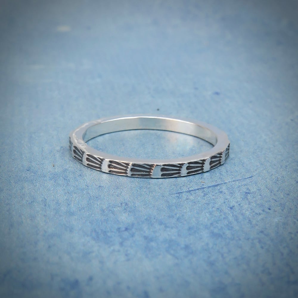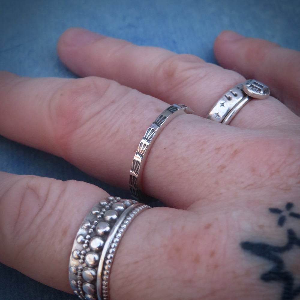 Handmade Sterling silver ‘Echo’ stacking ring stamped with a repeating sunburst pattern.