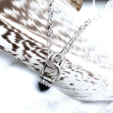 Handmade Sterling silver pendant. Set with a tiny 5mm black spinel bullet. Polished and oxidised to define the detail.