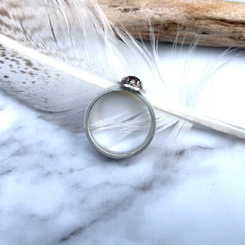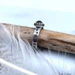 Set with a faceted smoky quartz. The band is hand stamped with stars.