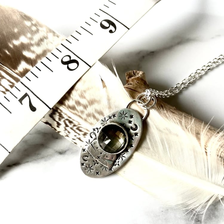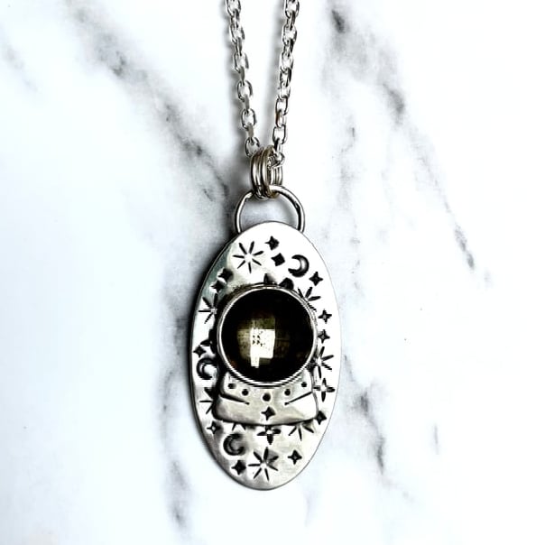 The pendant has been oxidised and polished to define the celestial stamping detail.