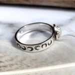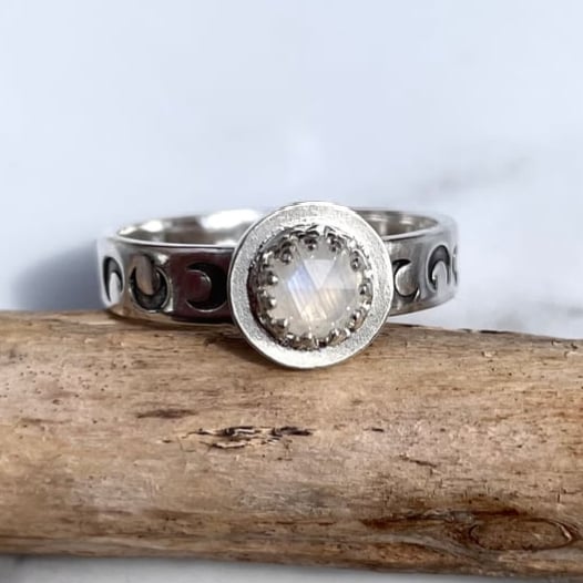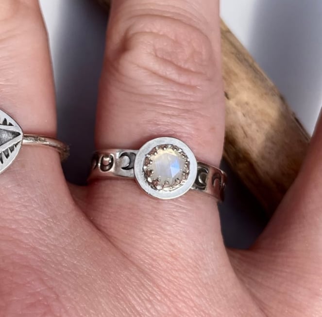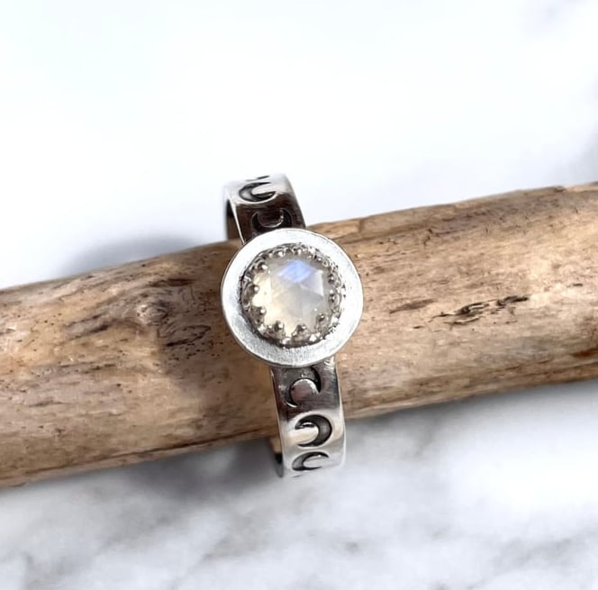 Set with a faceted rainbow moonstone. The band is hand stamped with crescent moons.