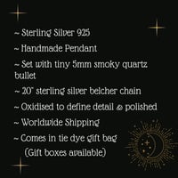 Handmade Sterling silver pendant. Set with a tiny 5mm smoky quartz bullet. Polished and oxidised to define the detail.
