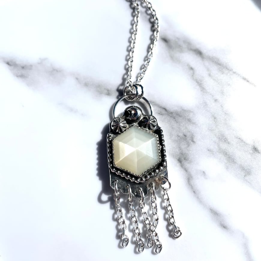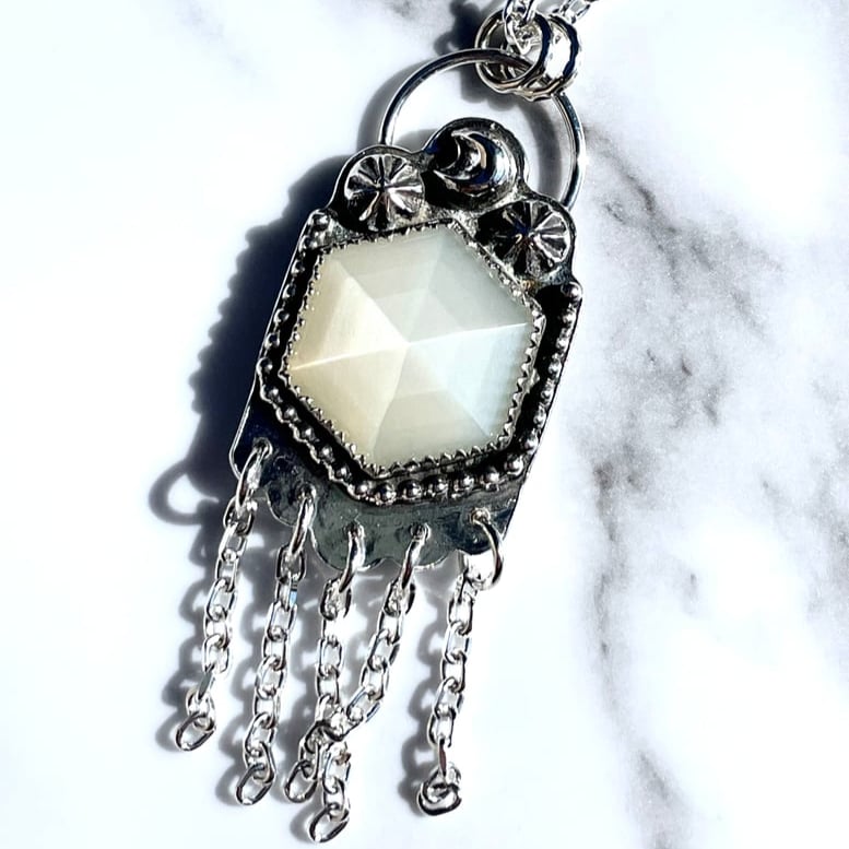 Handmade from Sterling silver and set with faceted white moonstone. This pendant is a larger version of the rainbow moonstone pendant I make.