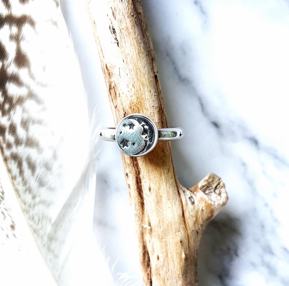 Looking for a cute stacker? This handmade celestial man in the moon ring is just a dream.