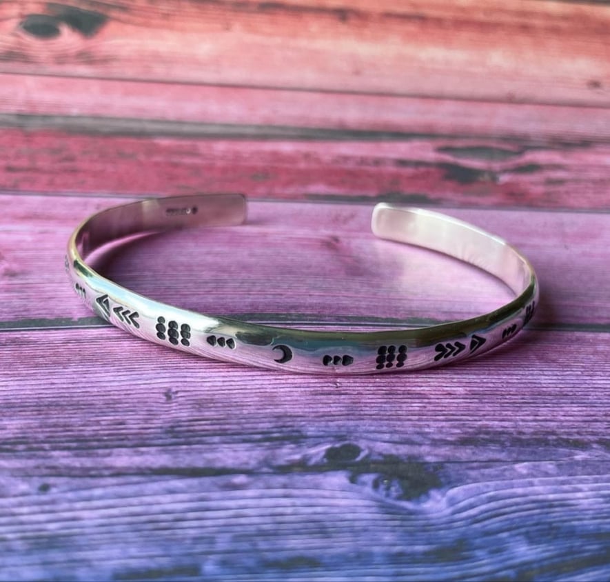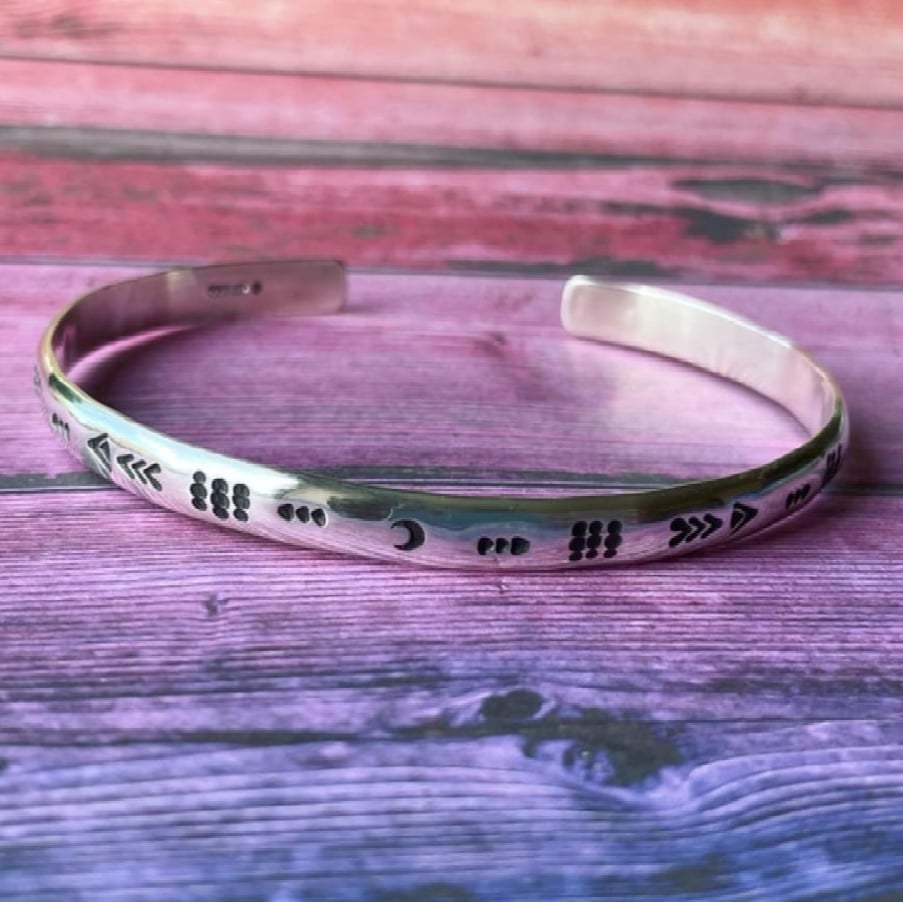 'Luna' symbol stamped cuff bracelet. Slim silver Aztec patterned cuff bracelet.