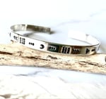 Luna symbol silver stamped cuff bracelet. Handmade crescent moon patterned bracelet (6mm)