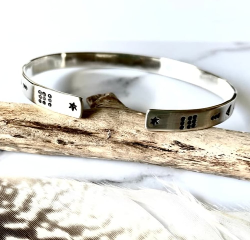 Part of the ‘Luna’ range. This handmade Sterling silver cuff bracelet is hand stamped with a crescent moon in the middle, triangles arrows and dots all the way along and a star at each end.