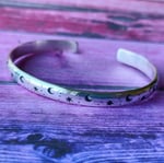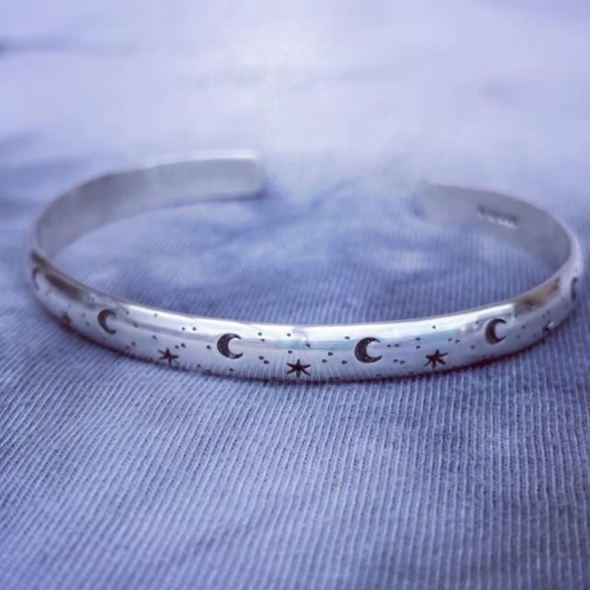 The silver has been stamped with star and moon symbols and tiny dots along it’s length.