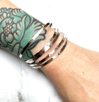The bangles are made from 1.5mm thick silver wire that has been hammered in to shape.