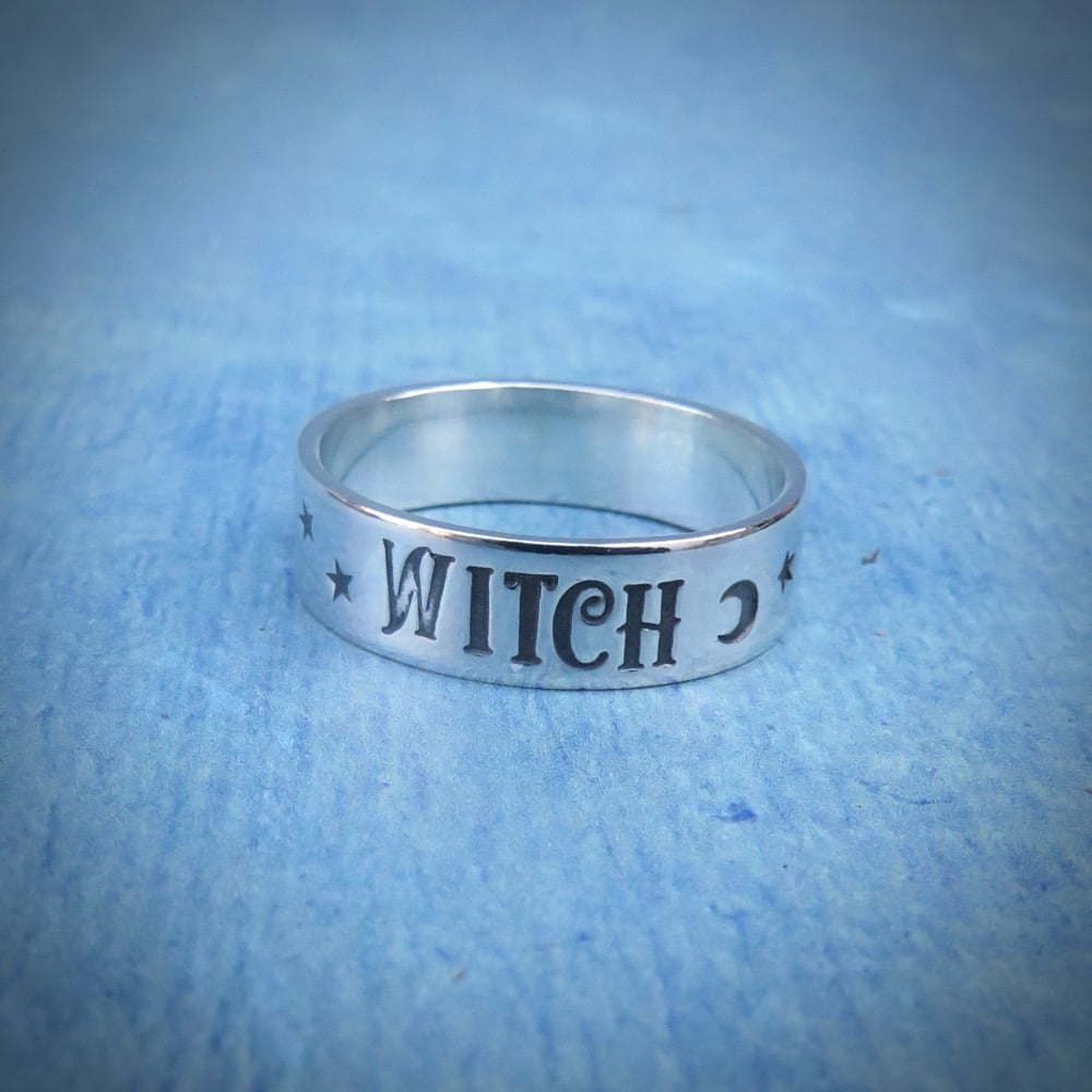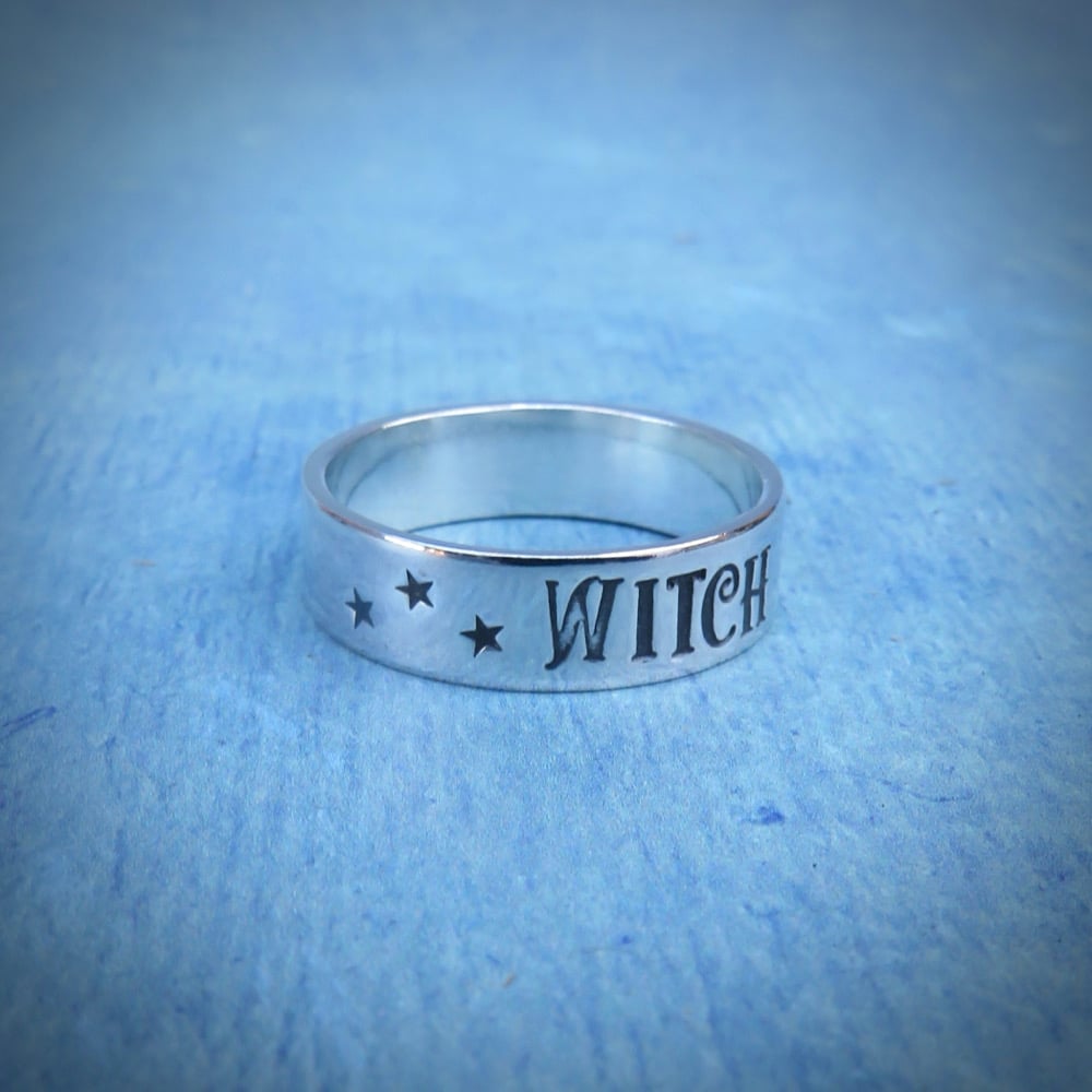 Handmade Sterling silver ring stamped with 'WITCH' and tiny five point stars and a moon stamp.