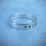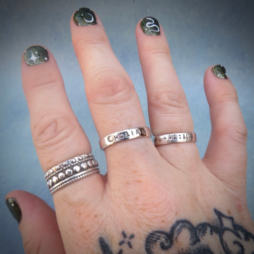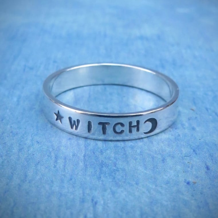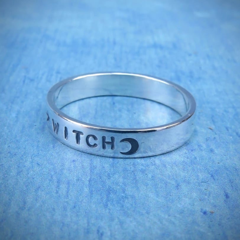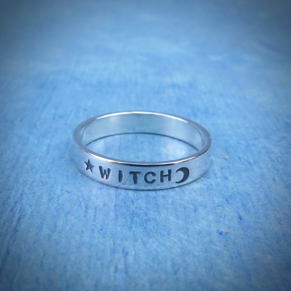 Handmade Sterling silver ring stamped with the word WITCH and a five point star and crescent moon.